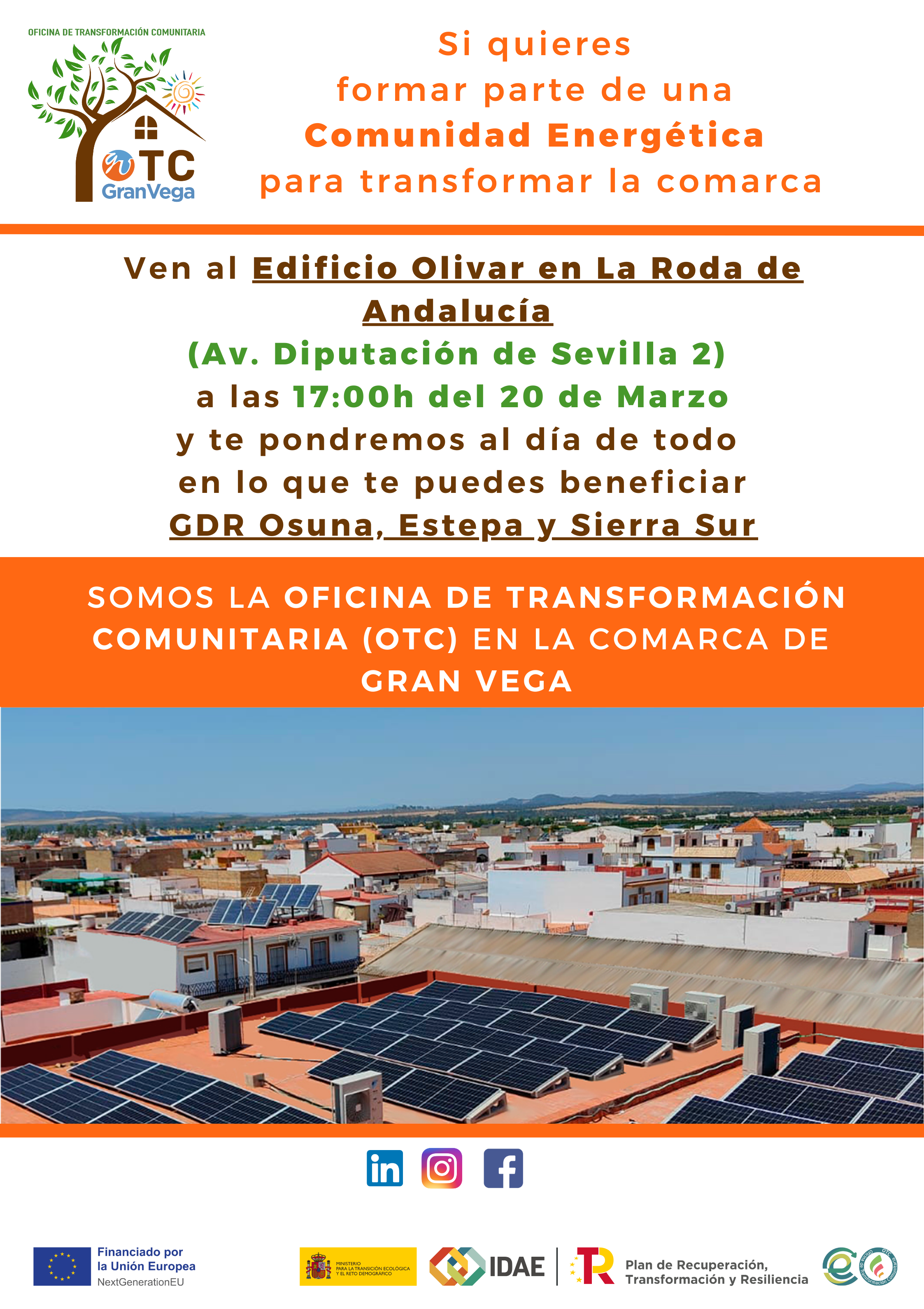 La Oficina de Transformación Comunitaria del Grupo de Desarollo Rural Gran Vega en colaboración con Grupo de Desarrollo Rural de las Comarcas Osuna, Estepa y Sierra Sur de Sevilla y el Ayuntamiento de La Roda de Andalucía celebrará el próximo jueves 20 marzo, a las 17:00h, en La Roda de Andalucía, una jornada informativa sobre Comunidades Energéticas, enfocado a la ciudadanía y colectivos sociales y empresariales de la Zona Rural Leader Osuna, Estepa y Sierra Sur de Sevilla.